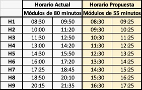 Queremos informarles que a partir del lunes 4 de noviembre hemos modificado transitoriamente la estructura horaria, lo que permitirá tener módulos de clases más cortos (55 minutos) y hará posible el término anticipado de la jornada a las 17:25 horas, mientras sea necesario.