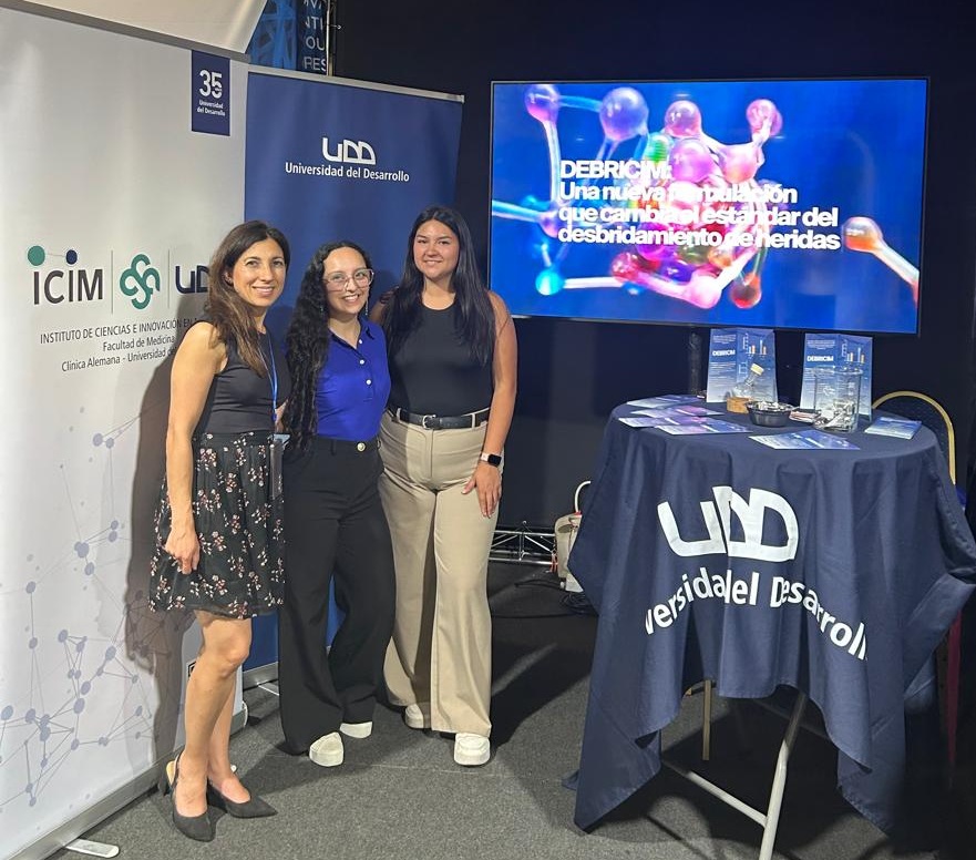 La doctora Belén Olivares, junto a las ingenieras en Biotecnología Paulina Hernández y Paz Cárcamo del Instituto de Ciencias e Innovación en Medicina (ICIM), representaron a la Universidad del Desarrollo en la primera versión de la Expo Heridas 2025: «Ciencia y Tecnología al Cuidado de las Personas y Medicina de Animales Convencionales».